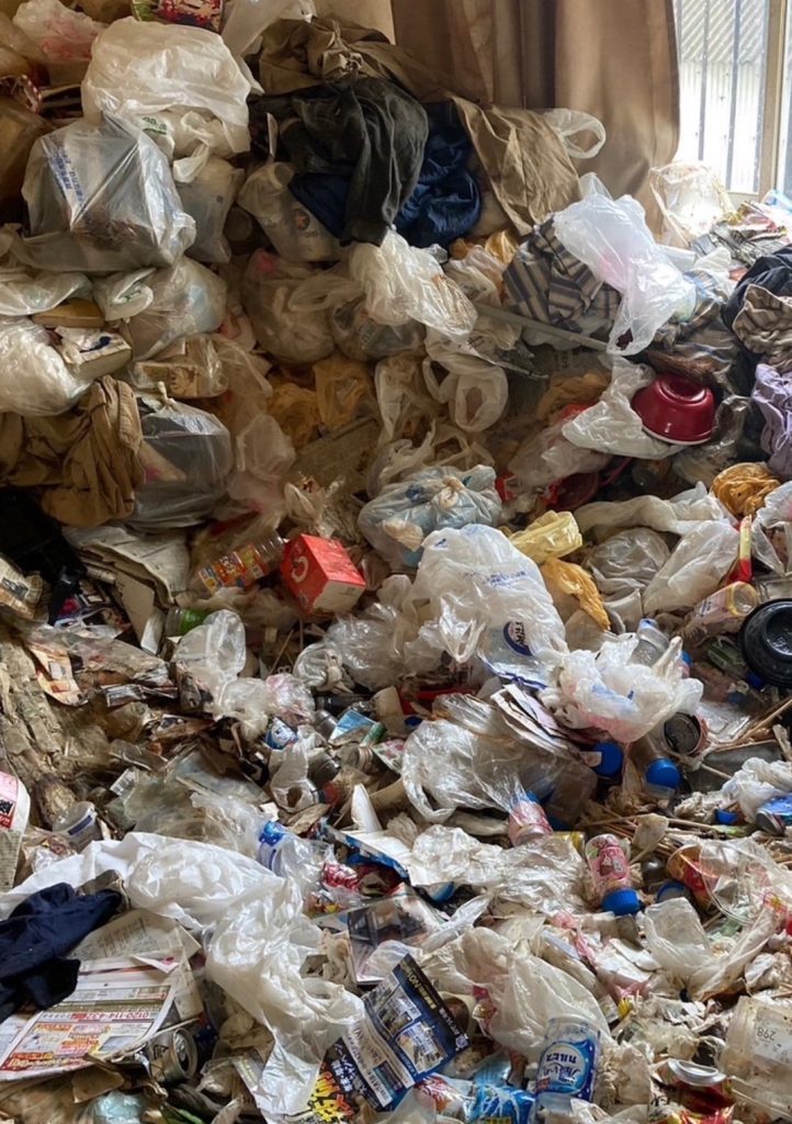床一面にペットボトルや衣類が散乱していましたが、作業員3名・トラック2台で1日かけて片付け完了。費用は約18万円でした。
